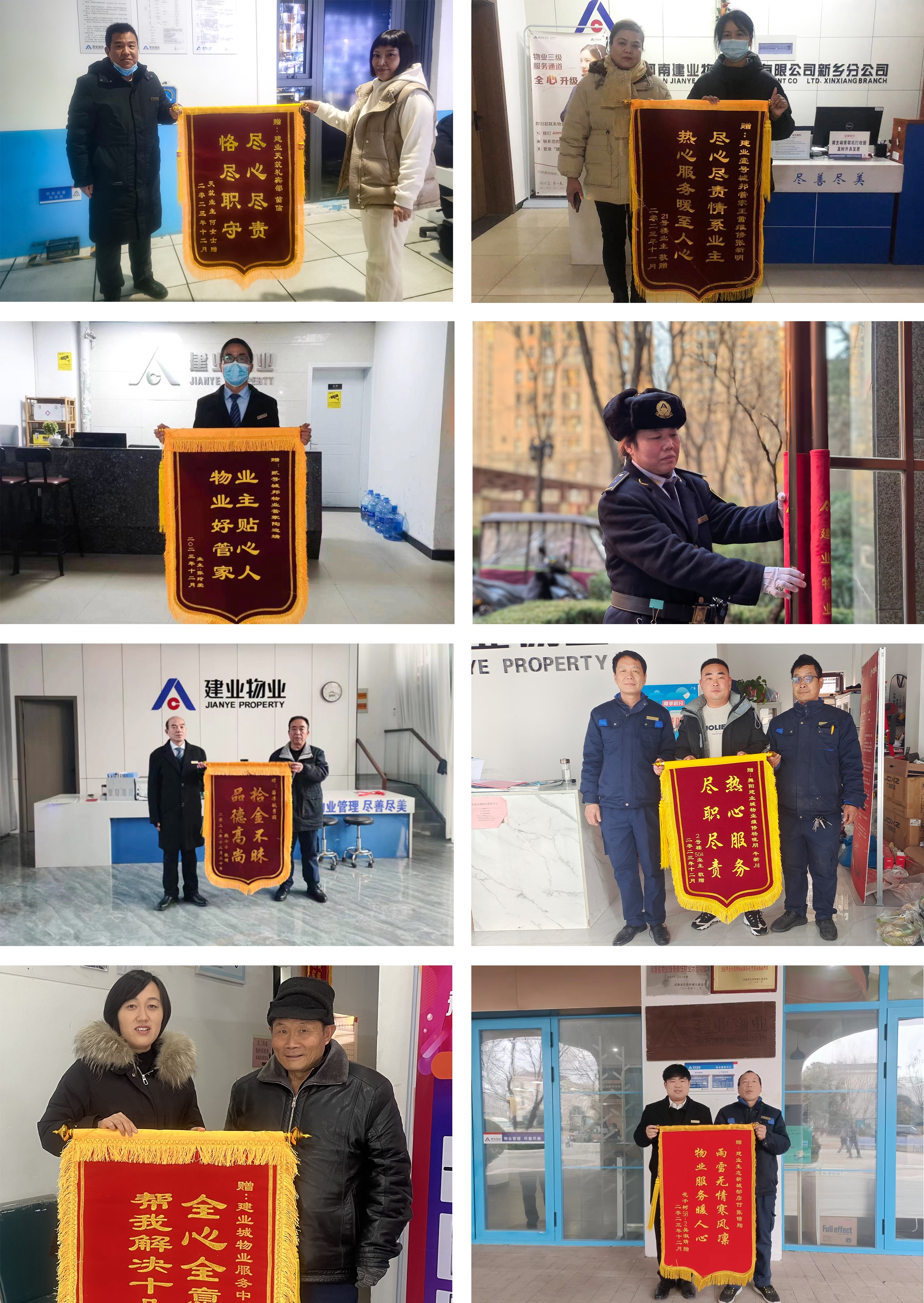 12月份,建業(yè)物業(yè)在管園區(qū)涌現(xiàn)出好人好事857件,其中收到錦旗231面、感謝信88封,其他致電表揚等533次。