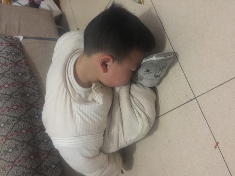 劉峰麗兒子在冰涼的地板上睡著了