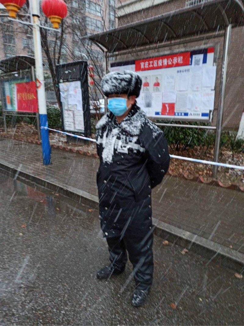 不巧的是,泰山小區(qū)值班室因電路故障無法正常取暖,室外大雪紛飛,室內(nèi)寒氣逼人。但南陽魏崗片區(qū)的禮兵沒有一人因寒冷而離開崗位,他們面迎寒風(fēng),身披雪花,對出入小區(qū)車輛、人員檢查登記和往常一樣認真。他們堅定內(nèi)心、堅守崗位,將時刻守護業(yè)主的責任牢牢地扛在肩上。